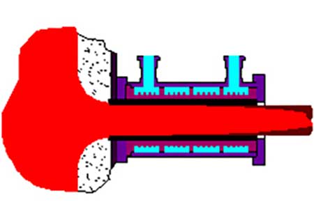 During the continuous casting process, molten iron enters a water-cooled graphite die that is mounted on the bottom of a refractory-lined steel holding vessel. The die/cooler system is maintained at a temperature of about 200° F and depending on the size and grade of the bar being cast, the molten iron will be approximately 2600° F. The molten iron at the inside surface of the graphite die is rapidly solidified and forms the rim of the bar which is the only part that is solid as it exits the die.